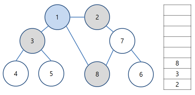 결과적으로 노드의 탐색 순서는 1 → 2 → 3 → 8 → 7 → 4 → 5 → 6 이다.