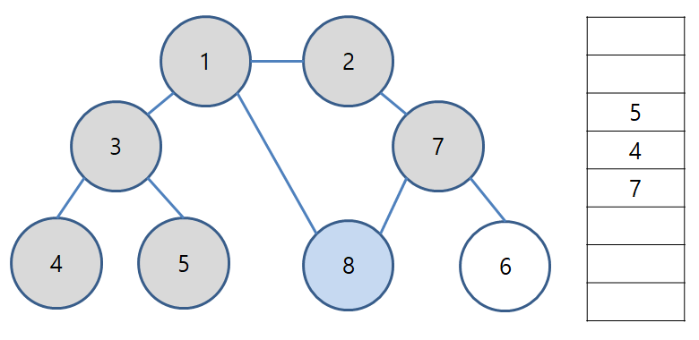 [step 5] 큐에서 노드 '8'을 꺼내고 방문하지 않은 인접 노드가 없으므로 무시한다.