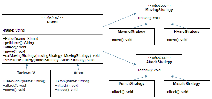 - 로봇이 변화되면서 문제를 발생시키는 요인은 이동 방식과 공격 방식의 변화다. 즉, 새로운 방식의 이동 및 공격 기능이 계속해서 추가 될 수 있으므로 기존의 로봇이나 새로운 로봇이 이러한 기능을 별다른 코드 변경 없이 제공받거나 기존의 공격이나 이동 방식을 다른 공격이나 이동 방식으로 쉽게 변경할 수 있어야 한다.