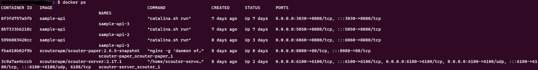 $ docker run -d --name="sample-api-1" -p 7070:8080 --network scouter-server_sample-network sample-api