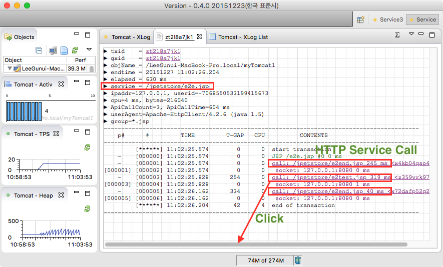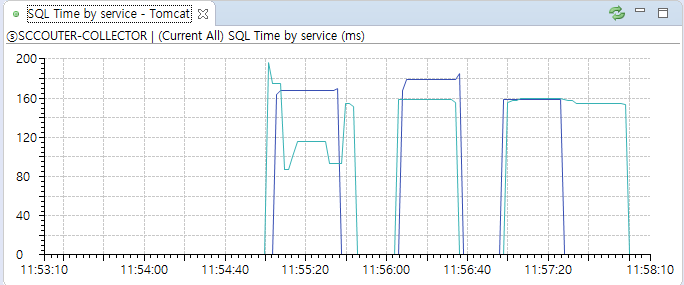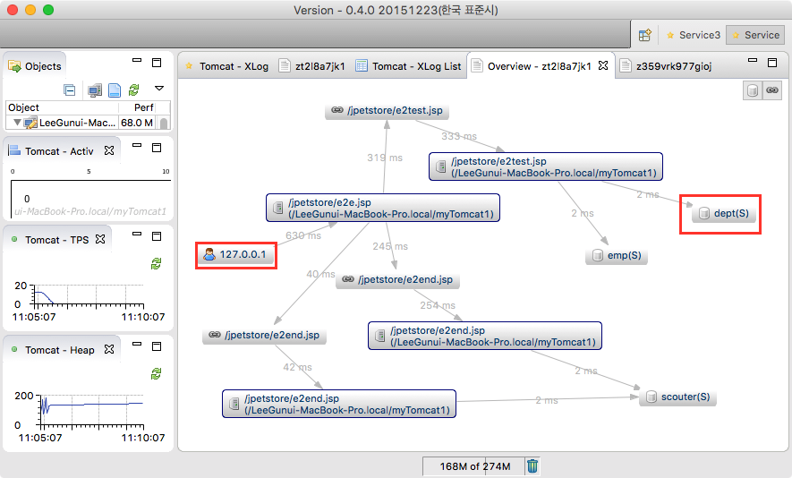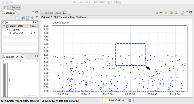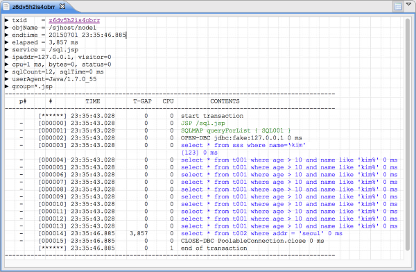 • XLog 점들에 대한 통계를 바로 확인할 수 있는 기능도 제공한다. 예를 들면 각 서비스에 대한 총 호출 건수 및 총 응답시간, 평균 응답시간, SQL 및 API 호출에 대한 평균 응답시간 등을 확인 할 수 있다.